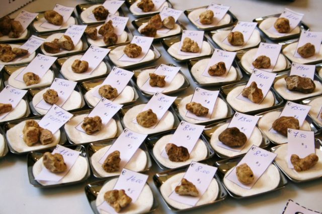 Trozos y cuerpos frutales enteros de hongos subterráneos en una de las subastas italianas