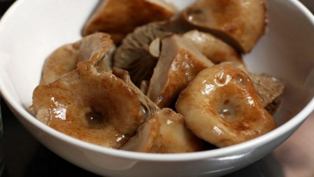 En la foto y el video se puede ver cómo cocinar hongos de leche de roble. Las tapas empapadas se colocan en un recipiente de cocción, se vierten con agua fría y se llevan a ebullición durante 15-25 minutos. El adobo se hace al mismo tiempo. Proporción por 1 kg de materia prima: