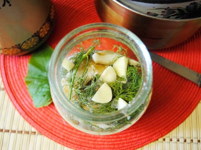 - realce el sabor con hojas de laurel y grosella, hoja de rábano picante picada, eneldo, pimienta de Jamaica o pimienta negra;