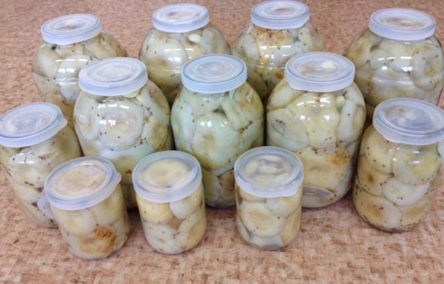 El método principal para preparar podgruzdki blanco es la salazón. Antes de eso, los champiñones se hierven durante 15-20 minutos y luego se colocan en frascos en capas mezclados con sal y especias. Además de la salazón, también se utilizan otros métodos de enlatado, por ejemplo, el decapado.