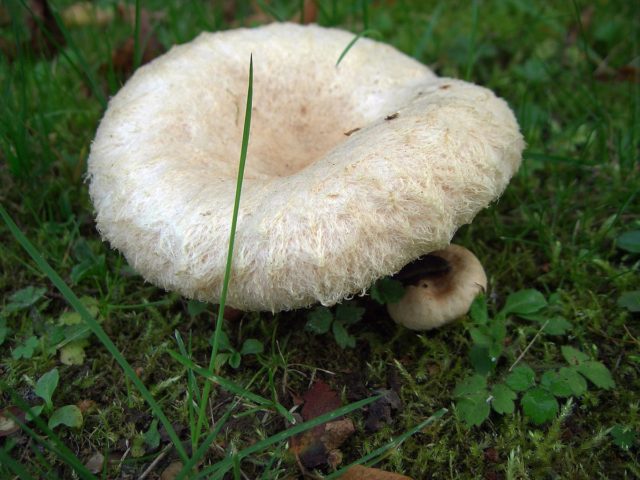 - Volnushka blanco... Este también es uno de los representantes de la familia Millennium, por lo tanto, el jugo lechoso ciertamente aparecerá en un corte o rotura en este hongo. El lobo blanco es fácil de distinguir del algodoncillo seco por su gorra muy pubescente y, a veces, viscosa. Este hongo es condicionalmente comestible y se puede comer, sin embargo, primero se requiere un largo remojo en agua.