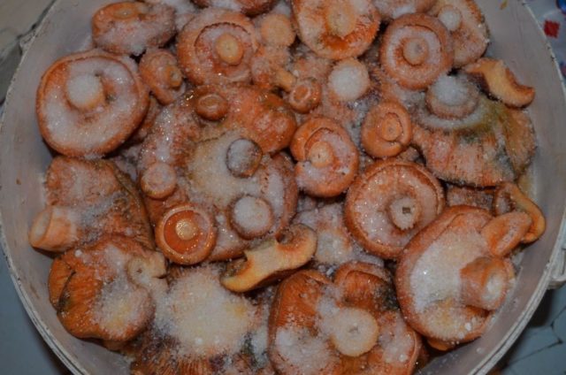 La salazón primaria dura 14 días a una temperatura de 10-20 grados. Después de eso, el recipiente se saca durante un mes y medio a la bodega, donde la temperatura es de hasta 5 grados. Este método le permite almacenar hongos en el refrigerador o en el sótano hasta por 1 año. También puedes ver otra receta de champiñones en escabeche para el invierno.