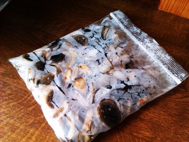 Después de hervir, las setas se dejan escurrir y enfriar, mientras que es recomendable colocarlas bajo opresión para que desprendan la mayor cantidad de líquido posible. De lo contrario, después de descongelar, su sabor será acuoso. Luego, las filas se colocan en bolsas de plástico, envueltas de tal manera que se obtiene una capa. Es importante que quede la mínima cantidad de aire en el interior. Después de eso, los paquetes se almacenan en un congelador horizontal.
