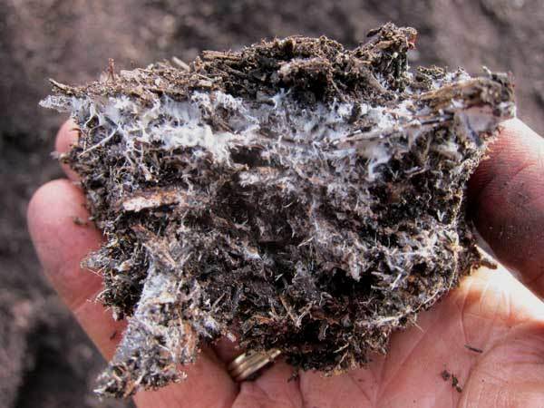 - Distribuimos uniformemente sobre la superficie del sustrato de acuerdo con las instrucciones. Mezclar con tierra. Controlamos el contenido de humedad del sustrato. La capa de suelo sobre el micelio no debe tener más de 7 cm de espesor.