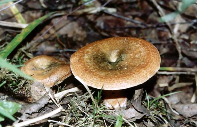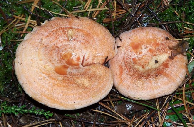 - Pino. Prefiere crecer en bosques de pinos y coníferas de la región de Kirov. Se encuentra con más frecuencia que otras especies. Se puede reconocer por su color rojo-rojo y su estructura densa. El sombrero de color amarillo anaranjado, de 18 cm de diámetro, tiene una forma redondeada con una pequeña depresión en el centro. La superficie es viscosa al tacto, se vuelve pegajosa después de la lluvia. Después del corte, aparece un jugo lechoso con un regusto acre y un aroma resinoso. La pulpa densa después del corte cambia de color a un color verdoso. Los especímenes pequeños se ven hermosos en forma salada y en escabeche.