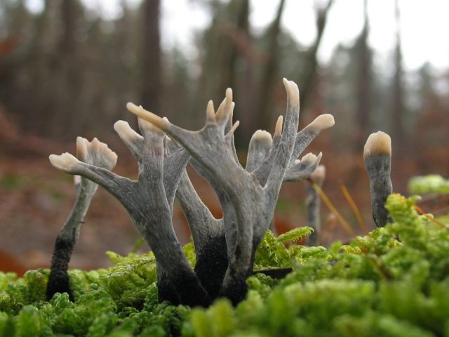 En la vida cotidiana, la xilaria hypoxilon a menudo se llama cuernos de venado debido a la similitud de forma, y en los países de habla inglesa, una mecha quemada, ya que el hongo tiene un color ceniza característico. Los cuerpos frutales son aplanados, tienen varias ramas dobladas o retorcidas. Una característica distintiva de este hongo de coral es un color negro aterciopelado, sin embargo, debido a las muchas esporas blancas, el cuerpo de la fruta parece ceniciento o espolvoreado con harina.