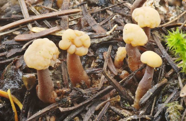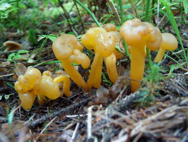 - Leotia gelatinosa - un pequeño representante no comestible del reino forestal. La especie crece en pequeñas familias en bosques de coníferas, sobre un sustrato en forma de aguja. Puede reconocer el hongo por su descripción externa: una tapa viscosa de color amarillo oscuro con un diámetro de hasta 2 cm, cuando se infecta con parásitos, la piel cambia de color a verde brillante. La superficie redondeada y llena de baches está cubierta de moco, la pulpa gelatinosa es de color amarillo verdoso, el olor y el aroma están ausentes. La pierna está cubierta de numerosas escamas ligeras, crece durante el período cálido.