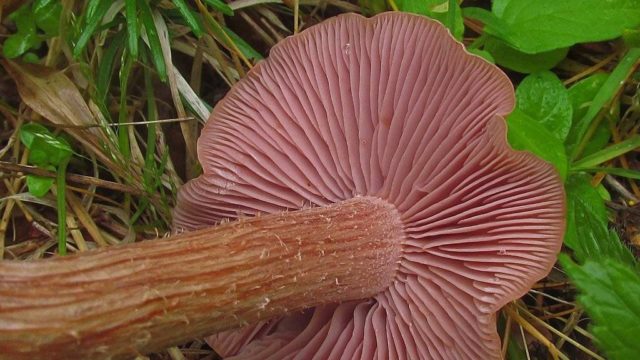 Las placas son delgadas, bastante raras, se adhieren al tallo, son de color claro, arenoso-rosado o tienen un tono de chocolate con leche. La pulpa coincide con el color de la tapa, la raíz tiene un tinte púrpura. El polvo de esporas es blanco, las partículas son elípticas, puntiagudas.