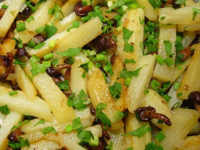 Sirva el plato terminado con hierbas finamente picadas. Puede agregar 4 cucharadas grandes de crema agria poco antes de que termine de freír y cocinar a fuego lento durante 5-10 minutos debajo de la tapa.