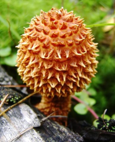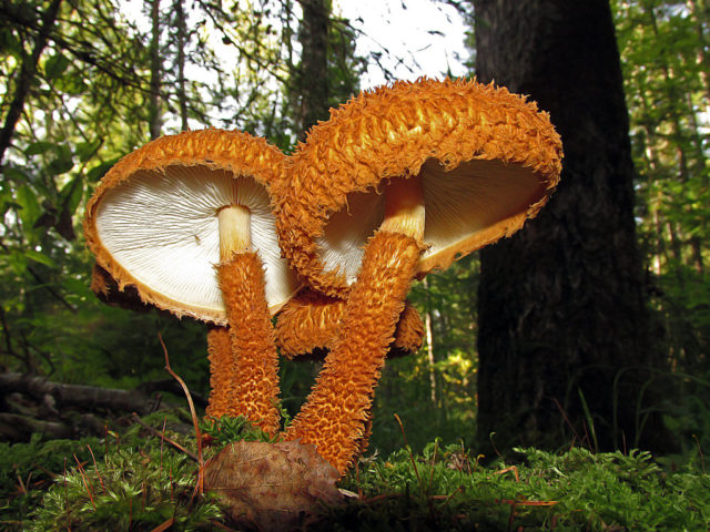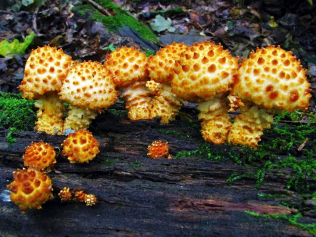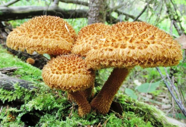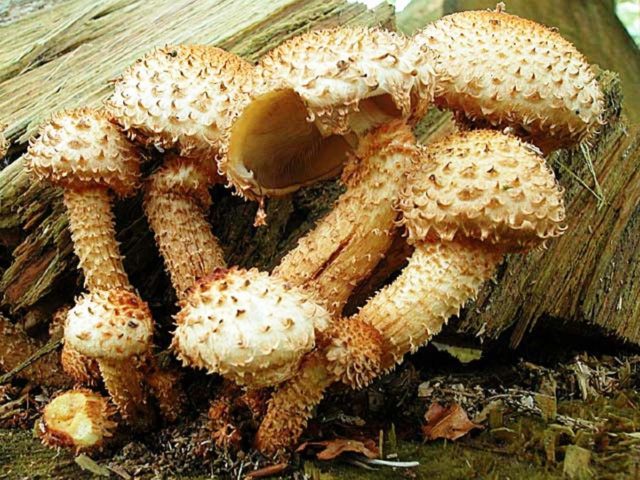 - Escamoso común - común en bosques caducifolios y coníferos. Crece en tocones, troncos de árboles y sus rizomas.Diferencias de variedad: un sombrero ancho crema claro con numerosas escamas y una pierna larga y delgada, coloreada a juego con el sombrero. La variedad es comestible, de pequeños ejemplares se obtienen hermosos y sabrosos platos fritos, guisados y en escabeche.