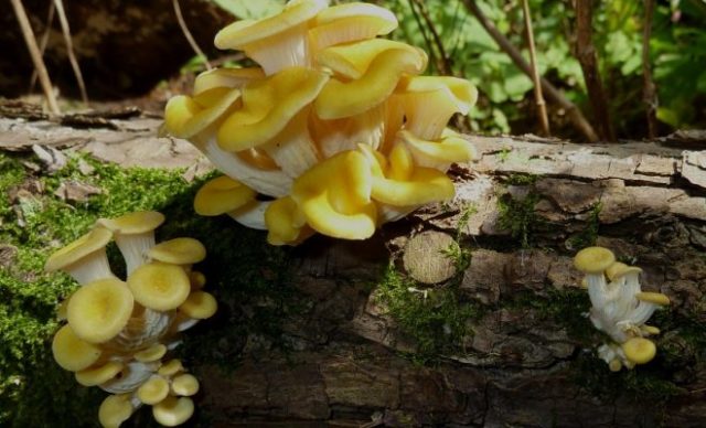 El hongo ostra amarillo crece en grupos de unos 30 hongos