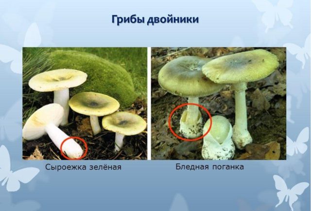 El gemelo venenoso de russula, que, cuando se ingiere, causa un malestar intestinal severo. Su parte superior mide hasta 20 cm, con un tubérculo grande, de color pardo grisáceo o amarillento. La pierna es densa, blanca, curva. Este falso doble se distingue por un aroma desagradable; en ejemplares jóvenes, el olor es harinoso.