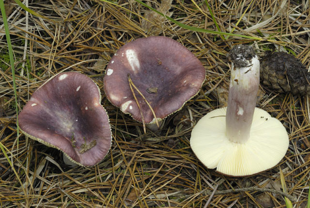 - Falso rubor... Según la foto y la descripción, la falsa russula se distingue por una tapa convexa y extendida. Hay una depresión en el centro. El color es morado con matices lilas y marrones. Hay estrías pronunciadas a lo largo de los bordes de la tapa. La pulpa es de color blanco-rojo, con regusto amargo. La falsa russula crece en grupos en bosques de abetos y pinos.