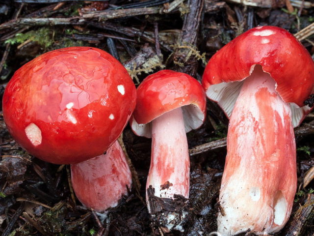 - Escozor... En los representantes jóvenes de esta especie, un sombrero convexo con bordes acanalados se convierte gradualmente en uno postrado y lleno de baches. La piel brillante se vuelve pegajosa cuando llueve. El color de la gorra es de rosa pálido a rojo intenso. Tienen manchas blancas o amarillentas en la superficie. La pulpa esponjosa tiene un aroma afrutado o picante. Russula se conoce como falso debido a su sabor picante.