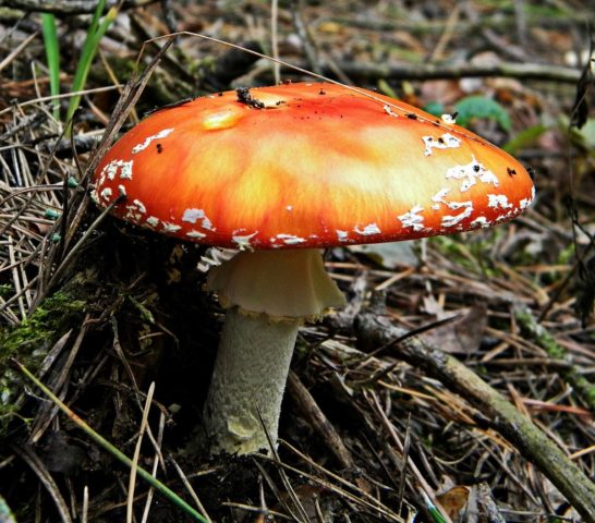 Hongo laminar no comestible con un gran casquete de hasta 20 cm de tamaño, de color naranja brillante o rojo. Las escamas blancas se encuentran en la superficie. En un hongo joven, están ausentes, lo que es el motivo de la confusión con russula. La pierna de Amanita es más alta, alcanzando los 8 - 20 cm. La pulpa del falso doble es venenosa, causando intoxicaciones y alucinaciones.