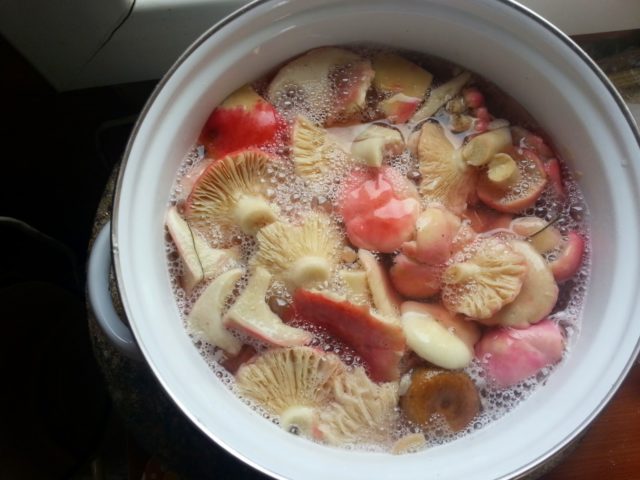 Antes de cocinar, la russula se coloca en agua fría limpia. Se mantienen durante 5-6 horas. Como resultado, las toxinas dañinas para la salud humana se eliminan de la pulpa. Se debe drenar el agua. Luego, la masa se coloca en una cacerola para hervir. Se vierte con agua fría y se enciende el fuego lento. El tiempo mínimo de cocción es de 10 minutos.