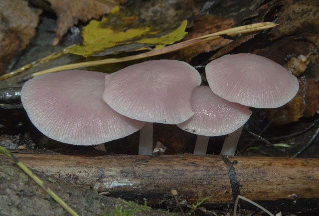 Mycena es un hongo venenoso que parece una russula. Su gorro es pequeño, de hasta 6 cm de tamaño, acampanado o plano. El cuerpo de la fruta es suave, de color rosado, con un olor acre. La pierna es delgada, mide hasta 10 cm de largo y la falsa gemela da frutos abundantes de julio a noviembre. A menudo crece debajo de hayas o robles, individualmente o en pequeños grupos.
