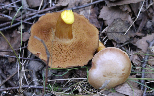 La capa inferior de la gorra es como una esponja. El color del himenóforo suele ser el mismo que el de la parte superior de la tapa, quizás un poco más claro. Cuando se presiona, aparecen manchas rojizas en la superficie tubular porosa.