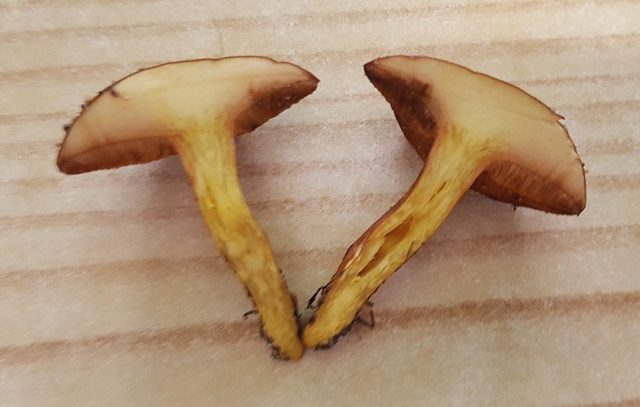 La forma de la pierna es cilíndrica. En algunos ejemplares, puede estar curvado. La pierna se estrecha ligeramente hacia la parte inferior. Arriba, crece junto con el himenóforo. La altura de la pata es de hasta 8 cm, de diámetro crece de 3 mm a 1,5 cm, su carne es elástica y se rompe fácilmente al presionarla. El corte al aire adquiere un tinte rojizo.