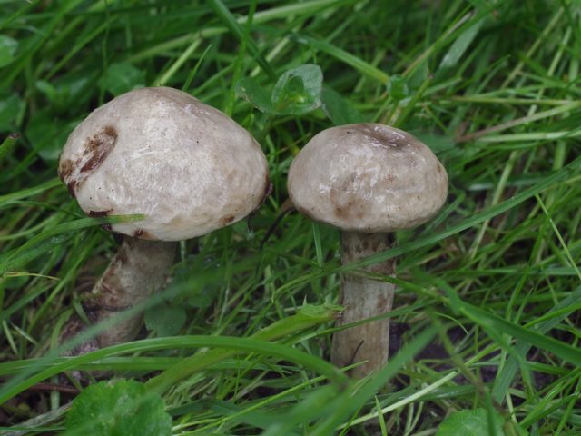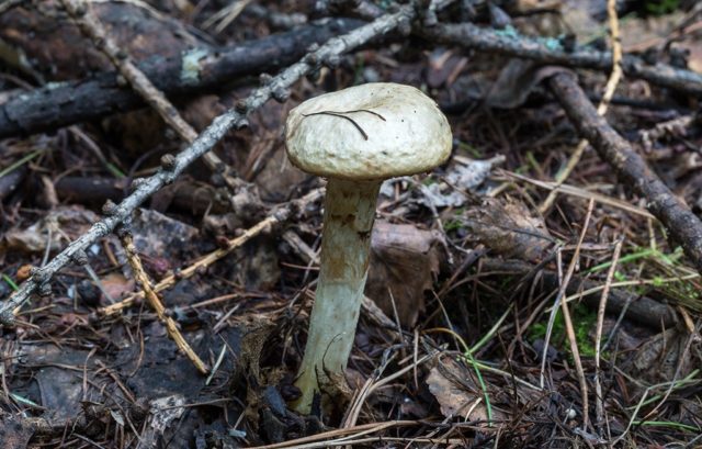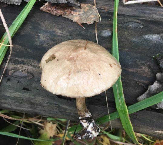 La pata tiene una estructura densa, alcanza los 10 cm de altura, el hongo joven tiene un anillo de fieltro ancho, que desaparece en la etapa de madurez. El color de este representante puede ser amarillento, pardusco o gris pálido, con un tinte oliva y morado.