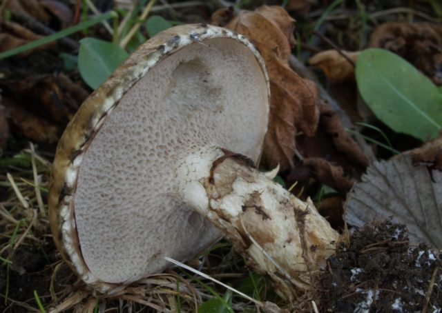 En la parte posterior de la gorra, se nota una capa tubular, que es de color blanco grisáceo o marrón grisáceo. La pulpa es blanquecina, cuando se rompe rápidamente se vuelve azul.