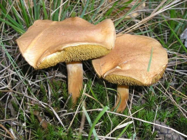 - Plato de mantequilla amarillenta (pantano) - falso engrasador de color amarillo-marrón. Crece solo en pantanos, se diferencia del pantano con una pierna delgada y curva (hasta 1 cm de diámetro) y tamaño pequeño (su tapa no supera los 7 cm de diámetro). Hay un anillo glandular en el tallo de tal hongo, que Suillusvariegatus no tiene. Esta especie de hongo pertenece a la categoría 4, se considera condicionalmente comestible debido a su sabor mediocre.