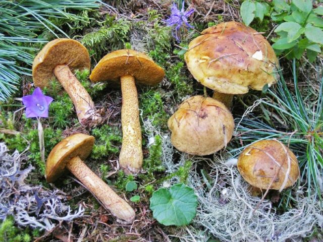 - Fengrasador de color amarillo-marrón. El color de la gorra es marrón, marrón, oliva. Diámetro 4-12 cm. El sombrero de los hongos jóvenes es semicircular, los más viejos son planos. La piel se separa en partes. La pierna es naranja, limón. Empiezan a aparecer en julio. Les encanta el suelo arenoso y seco de los bosques mixtos. Por regla general, son adyacentes a los pinos.
