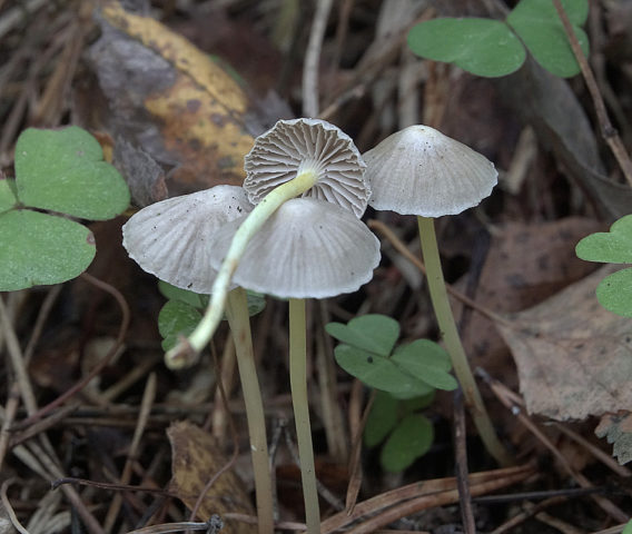 Mycena está húmeda. Difiere en tamaños más pequeños. El diámetro del sombrero es de 0,5 a 1 cm. En un hongo joven, tiene forma de campana o semiesférica, con el crecimiento se vuelve convexa, arrugada-picada con bordes desiguales, luego postrada, estriada o arrugada, con un borde tallado. Cuando está seco, se forma una placa escamosa en la superficie. El color es blanquecino o crema, en el medio es más oscuro: grisáceo, beige, ocre pálido. Las placas son blancas, delgadas, escasas, descendentes, con intermedias. Los basidios son dos esporas, las esporas son más grandes: 8-12 x 4-5 micrones. La pulpa es blanca, fina. La pierna con una cubierta mucosa, lisa, con un rasgo distintivo característico: gotas de líquido. Altura: de 3 a 3,5 cm, grosor de aproximadamente 2 mm. Arriba, el color es blanquecino, debajo es beige o leonado. Crece en pequeños grupos o intercrecimiento en bosques de coníferas y mixtos sobre madera podrida, hojas caídas y agujas. No es común, da frutos de junio a otoño. No hay información sobre comestibilidad.