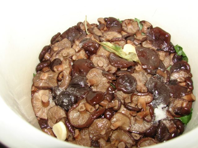 Después de una semana, puedes ver cómo va el proceso de fermentación. Si aparece un olor a humedad, significa que no hay suficiente sal, es necesario agregar una solución de 40 g por 1 litro de agua. También debe agregar agua si no hay suficiente líquido en la superficie. Una vez cada 15 días, se debe perforar el contenido con una espátula o el mango de una espumadera hasta el fondo para que el líquido “juegue”. El lactarius pardusco fermentado estará listo en 35-40 días.
