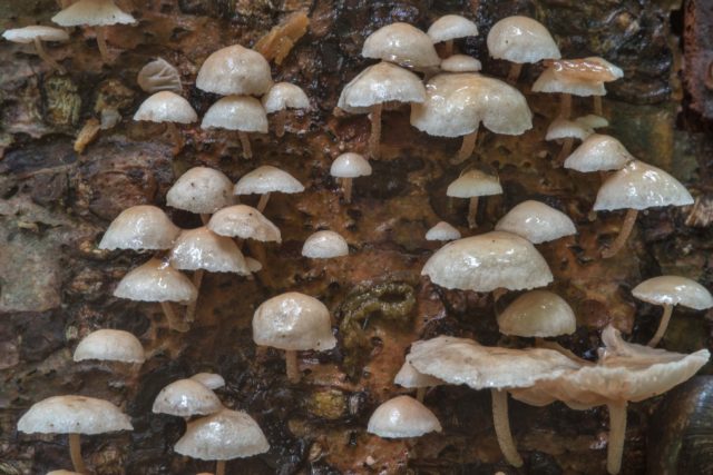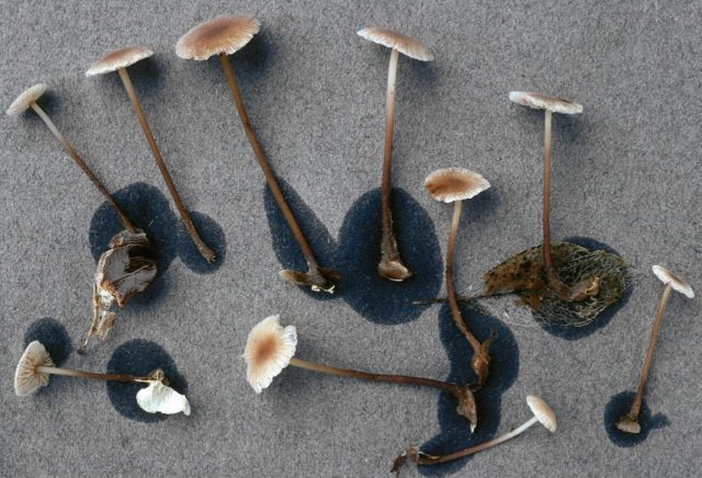 Pequeños cuerpos fructíferos frágiles de color uniforme y un fragmento más oscuro en la parte central del sombrero. El color es cremoso con un tinte rosado, no cambia durante toda la temporada de crecimiento.