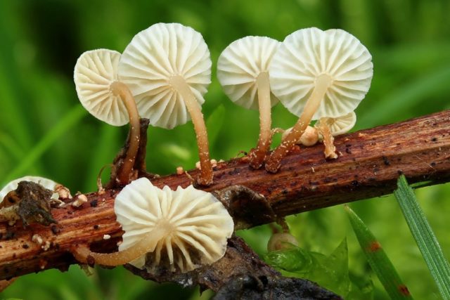 Iris ramificado o rama marasmiellus, el nombre latino es Marasmius ramealis. El hongo pertenece a la familia de Negniychnikovye.