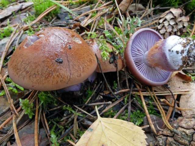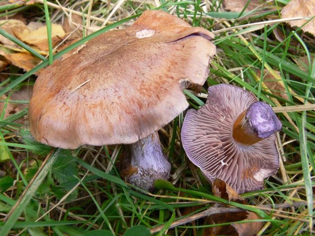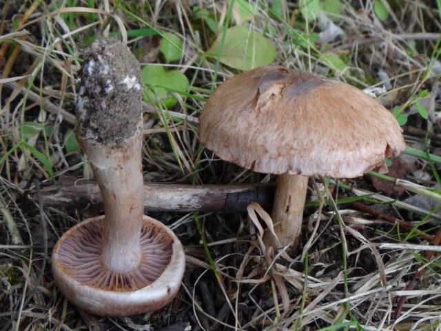 Webcap de cabra (traganus, maloliente). No comestible, tóxico. El color de la gorra y las patas es de color púrpura pálido con un tinte plateado. Se distingue por el color oxidado de las placas en un hongo adulto y un rico olor desagradable, que se intensifica durante el tratamiento térmico.
