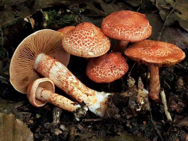 A una edad temprana, la tapa es esférica, con el tiempo se vuelve plana y aparece un tubérculo en el centro. En los ejemplares maduros se pueden observar bordes muy hundidos y agrietados. El tamaño de la tapa en diámetro varía de 3 a 8 cm. La superficie está finamente descascarada, cuyo color principal es el ladrillo. En el lado interior de las tapas hay platos carnosos y frecuentes. A una edad temprana, son de color púrpura.