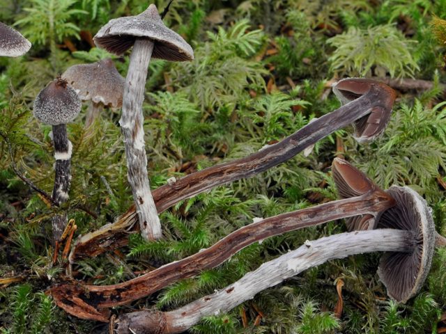 El tallo es denso, firme, longitudinalmente fibroso. Puede ser curvada, hueca por dentro, la pulpa es gomosa, elástica, de color marrón oxidado. La superficie está seca, cubierta de un velloso blanco grisáceo. Los tamaños alcanzan los 6-15 cm de largo y los 0,3-0,9 cm de diámetro. El color es beige, violeta-marrón, negro-marrón.