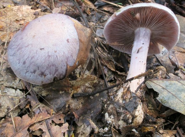 La superficie tiene un color gris violeta y una pulpa fina con un aroma desagradable. La pierna está cubierta con restos de una colcha con rayas y manchas rojas. El tiempo de fructificación dura desde julio hasta finales de octubre. La especie crece en bosques de pinos, prefiere áreas cubiertas de musgo.