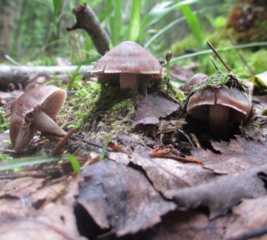 - Rojo brillante - Especie no comestible, crece de mayo a julio. Crece en familias pequeñas en lugares húmedos, bosques de coníferas y caducifolios. La pulpa es firme, con un característico aroma floral. Puede reconocer la especie por un pequeño sombrero cónico marrón-marrón y una pierna delgada y curva. La capa inferior está formada por placas anchas dentadas de color marrón claro.