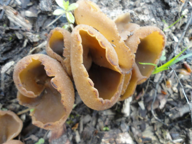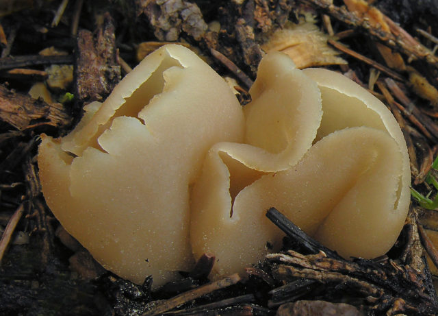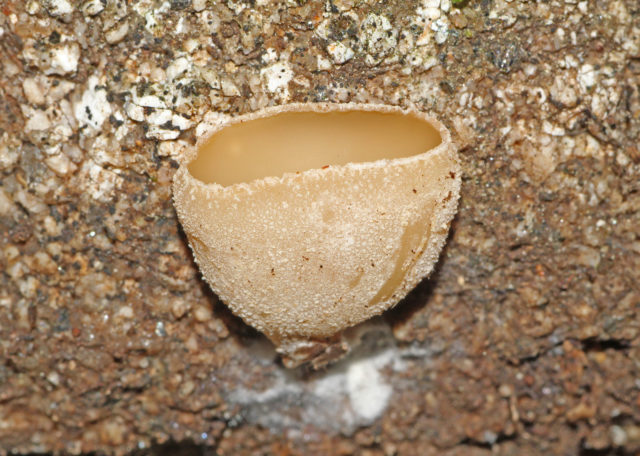 El tamaño del cuenco varía de 0,8 a 5-8 cm de diámetro. Himenio: la superficie interior está lacada, brillante, cerosa. El exterior es rugoso, cubierto de pequeñas escamas-granos contiguos. El color es crema, beige-dorado, miel, amarillo parduzco, ocre. La pulpa es quebradiza, blanca o café con leche. El polvo de esporas es blanco o ligeramente amarillento.