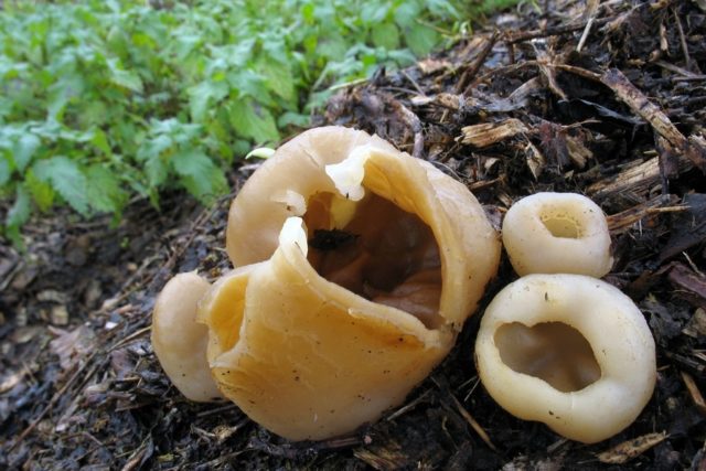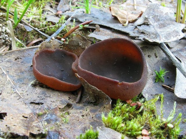 La pécidae es un hongo de tamaño mediano, que alcanza de 2 a 10 cm de diámetro. El ejemplar joven parece una burbuja, pero tiene un agujero en la parte superior. A medida que crece, el cuerpo fructífero se abre, adquiriendo una forma de copa. El hongo viejo tiene bordes rasgados irregulares. Hay un tallo falso, poco llamativo, de tamaño pequeño.