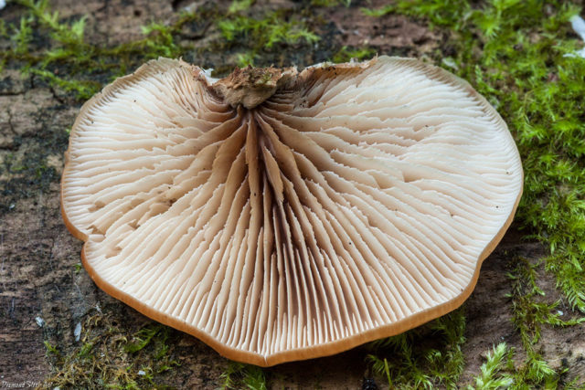 Las placas son frecuentes, delgadas, divergentes radialmente del lugar de fijación al sustrato. Los especímenes frescos son blancos, crema o rosáceos, cerosos, carnosos. Los secos son de color marrón pálido, con bordes dentados.