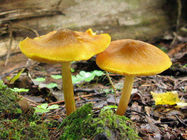 La cucaracha de color amarillo león es un pequeño hongo de un color brillante en un tallo muy delgado. La carne es densa, puede ser salmón, dorada o marrón. El color de la parte interior depende de la edad del cuerpo fructífero y del lugar donde crece el micelio. Polvo de esporas de color rosa claro. Los platos son frecuentes, sueltos y anchos. A una edad temprana son de color blanco rosado, a una edad más madura son de color rosa.