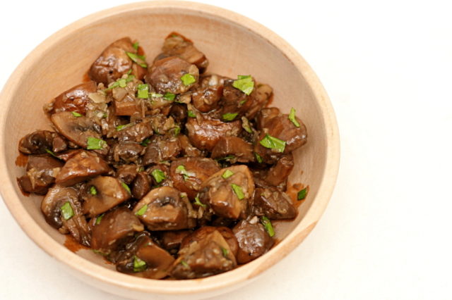 - Agregue freír, ajo, especias a los champiñones.