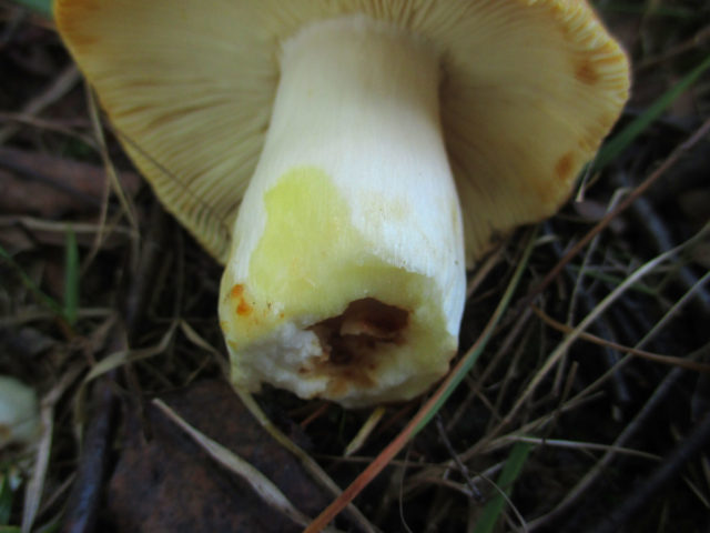 La pata cilíndrica, gruesa y densa alcanza los 10 cm de longitud, su circunferencia es de unos 2 cm. El color de la pata es blanco, aparecen manchas amarillas en los hongos demasiado maduros, la parte interior se vuelve hueca. Cuando se aplica hidróxido de potasio, la piel de la pierna se vuelve de color amarillo brillante.