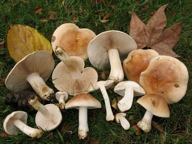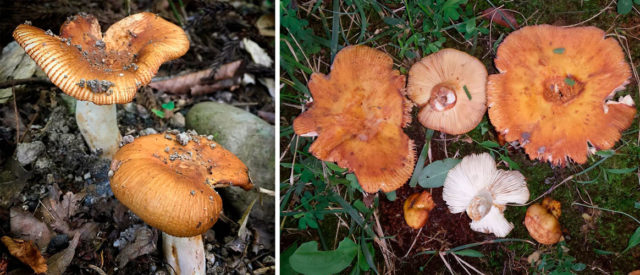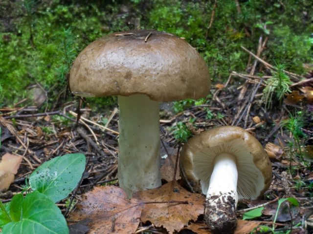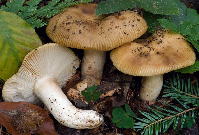 Russula de almendra, laurel y cereza (Russula grata), emana un aroma de almendras dulces. Su cuerpo frutal es algo más pequeño que el de la bodega. El sombrero es redondeado, abovedado, la pierna es crema, más larga y delgada que la del sótano. El gemelo está clasificado como una especie absolutamente comestible.