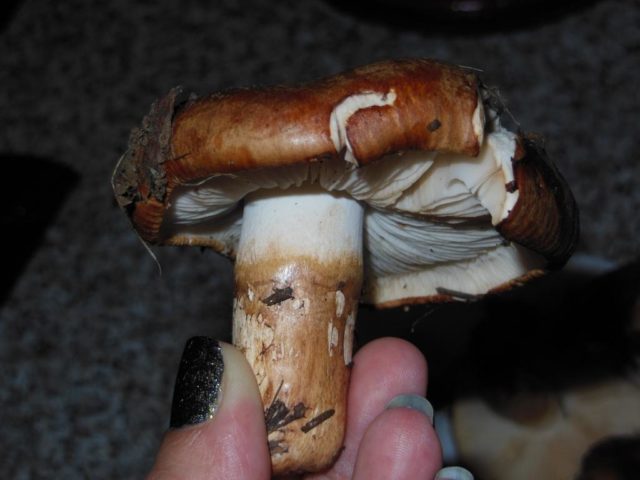 Un hongo comestible de color marrón oscuro se diferencia de uno blanco-marrón no solo en un tono de color, sino también en escamas notables en la superficie de la tapa. Incluso en climas húmedos, la piel de la parte superior permanece mate y no adquiere una viscosidad pegajosa.
