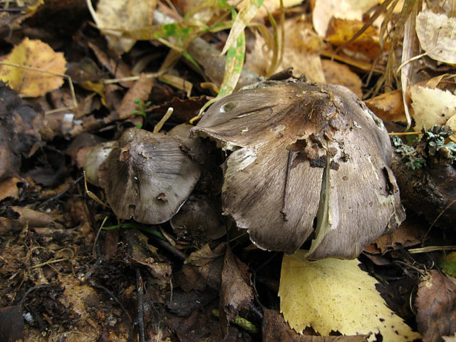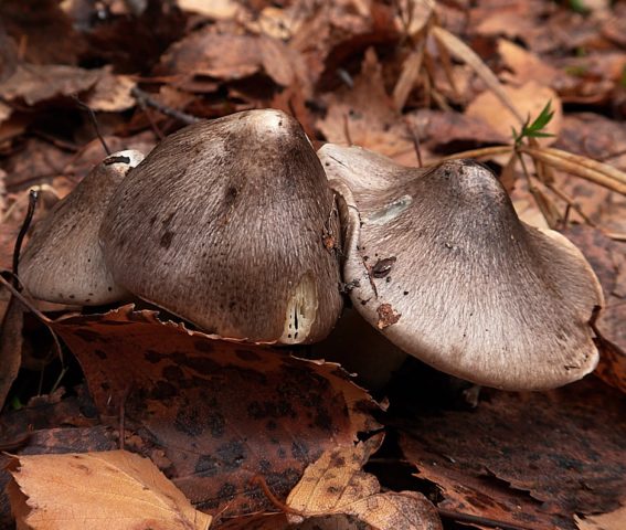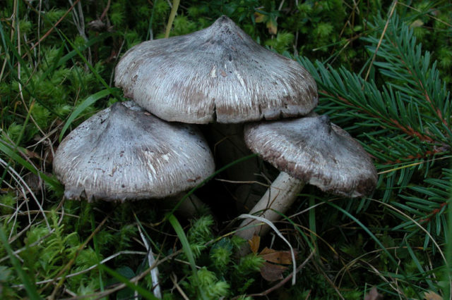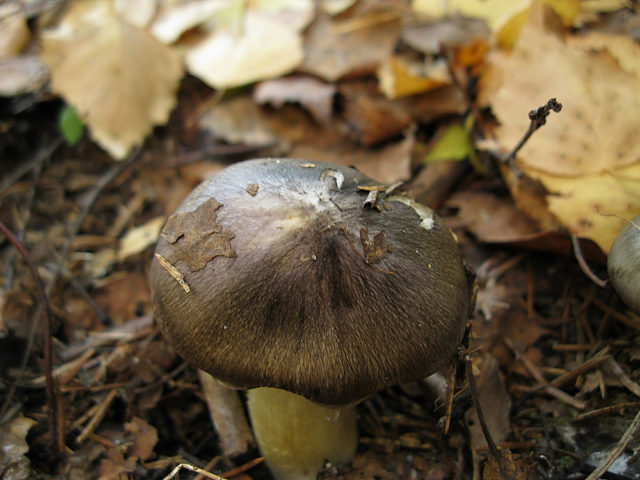 - Sombrero. El diámetro medio del sombrero es de 4 a 8 cm, en ocasiones se pueden encontrar ejemplares de mayor tamaño hasta 10 cm de diámetro. Con mucha humedad, la superficie se cubre con una película adhesiva y se puede pintar en diferentes tonos de paleta de grises: desde gris oscuro hasta gris oliva. El color no es sólido, sino texturizado. A través de las fibras coloreadas orientadas de arriba hacia los bordes, aparece un fondo claro con un trasfondo oliva, amarillento o verde claro. Los cuerpos de frutos jóvenes tienen una tapa cónica en forma de campana con bordes curvos. Con la edad, se postra, con un tubérculo en la parte superior. Sus bordes en un cuerpo fructífero maduro son uniformes o ligeramente curvados hacia arriba.