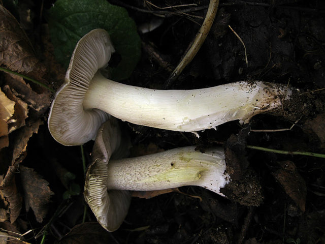 ¡Atención! Los tonos grisáceos en el color de las placas de los especímenes maduros son un signo poco informativo.No aparecen todos los años y no en todas las poblaciones de Row Gulden. - Pierna. La forma de la pierna no es correcta. Tiene un ligero ahusamiento, estrechándose hacia la base. Hay representantes jóvenes en los que la pierna puede tener un engrosamiento en el tercio inferior. Su rango de tamaño varía ampliamente: longitud - 4 - 10 cm, diámetro - 0,8 - 1,5 cm. En los ejemplares que crecen en pastos altos y densos, la pata es más larga. Los representantes de la misma población pueden tener patas, tanto lisas como con una superficie escamosa pronunciada. El color de las escamas puede ser de gris claro a gris sucio.