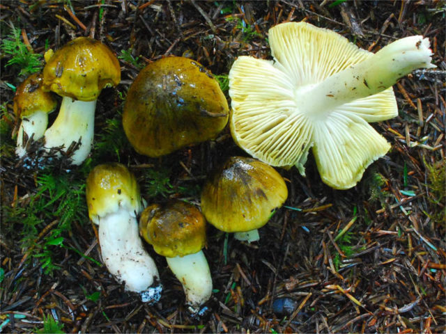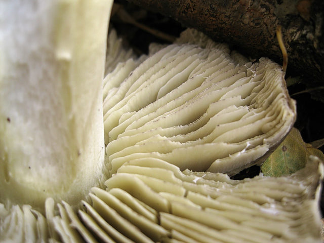 - Platos. El color de las placas es uniforme, amarillo pálido o verde blanquecino. Son anchos, adherentes, con poca frecuencia. Cada uno de ellos puede tener una muesca o muesca en el borde. Con la edad, en tiempo seco, las placas a lo largo del borde de la tapa se secan. El amarilleo de su color aumenta, aparecen tonos de gris. Los lugares de daño de las placas pueden tener bordes grises. En climas fríos, el grisáceo es menos pronunciado.