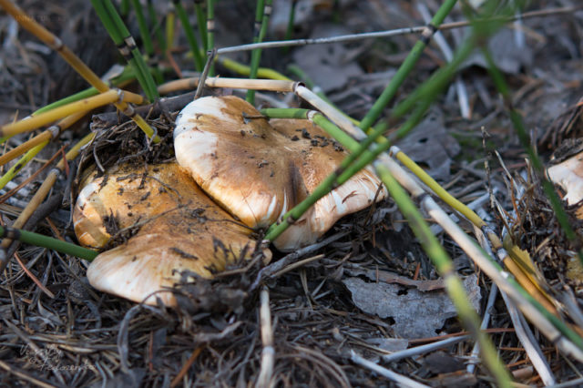 - El velo es de color beige claro. Este es un hongo venenoso, no puede comerlo (según algunas fuentes, esto es posible después de un tratamiento térmico prolongado). Se diferencia del ryadovka de un color ocre uniforme de forma ovalada de la gorra, así como una pierna más densa pintada en un color blanco uniforme.