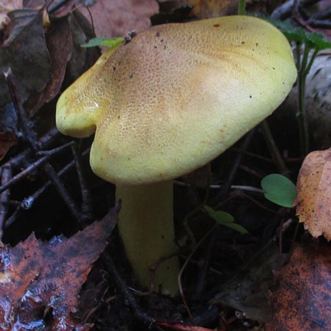 El tallo del hongo es alargado, la altura es de 5 a 10 cm, el indicador máximo es de 14 cm. El diámetro es de 0,7-2 cm, en grandes representantes de la familia es de 2,5 cm. La forma del tallo es cilíndrica. con una ligera expansión hacia la base. La superficie es lisa, se permite ligeramente fibrosa. El color es amarillo verdoso.