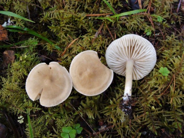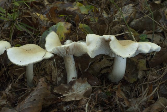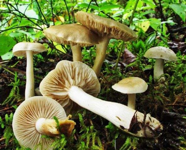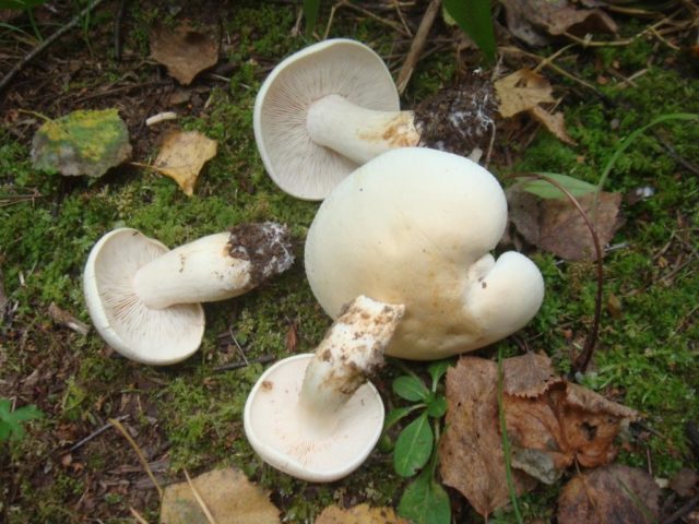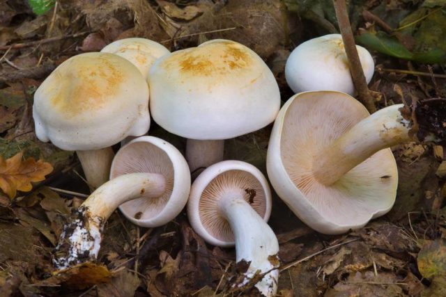 Tricholoma white es grande en comparación con el hediondo rowovka. La tapa de este hongo es de color amarillo grisáceo, tiene una forma convexa y extendida. También cerca de la fila blanca se pueden encontrar manchas ocres. La pata del hongo es de color amarillo sucio y alcanza de 5 a 10 cm de longitud. La pulpa de dicha fila es espesa, su olor depende del área de cultivo, en Rusia es más común un hongo con olor a moho, y fuera del país, con miel o aroma raro. Este representante de los Ryadovkovs se considera un hongo venenoso y no comestible. Así es como se ve en la foto: